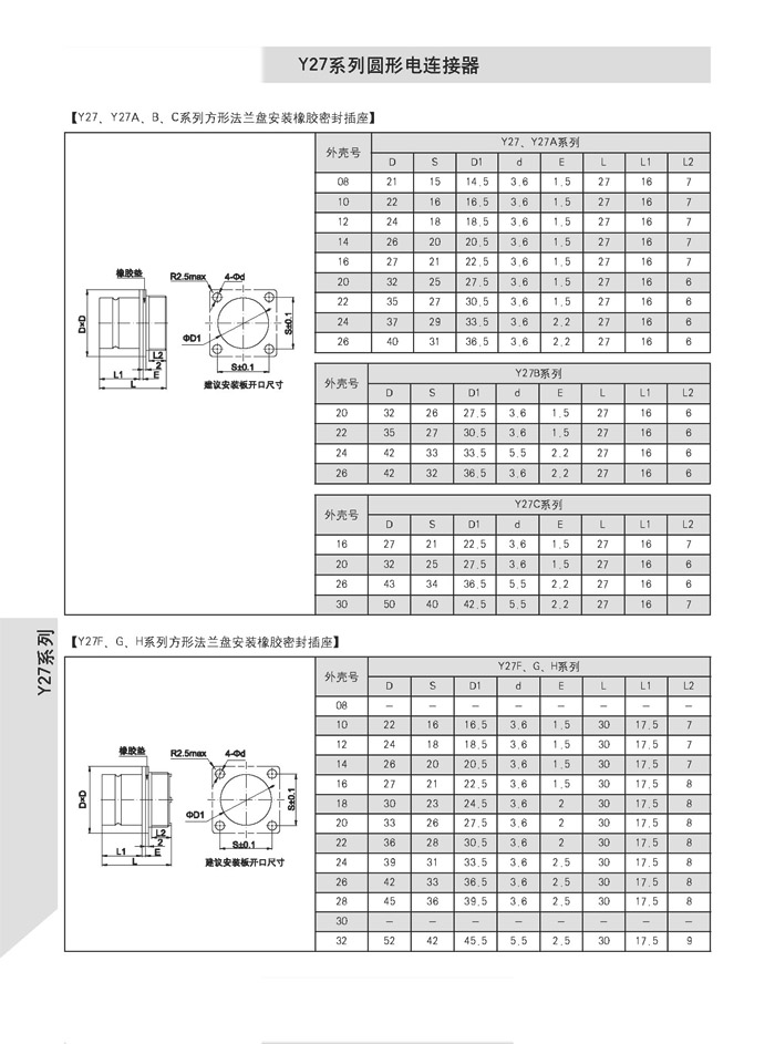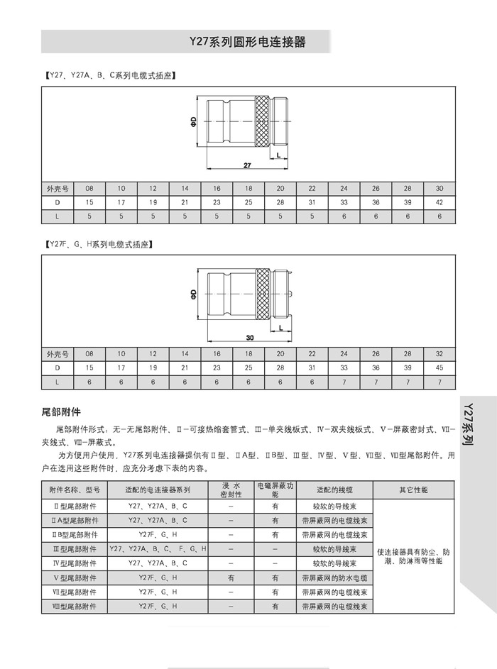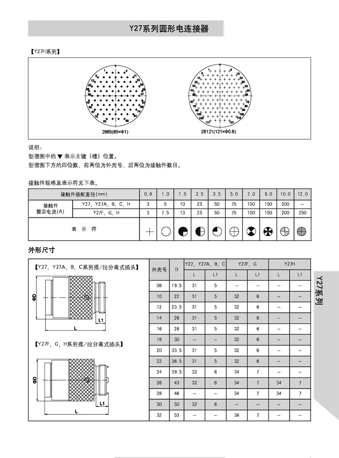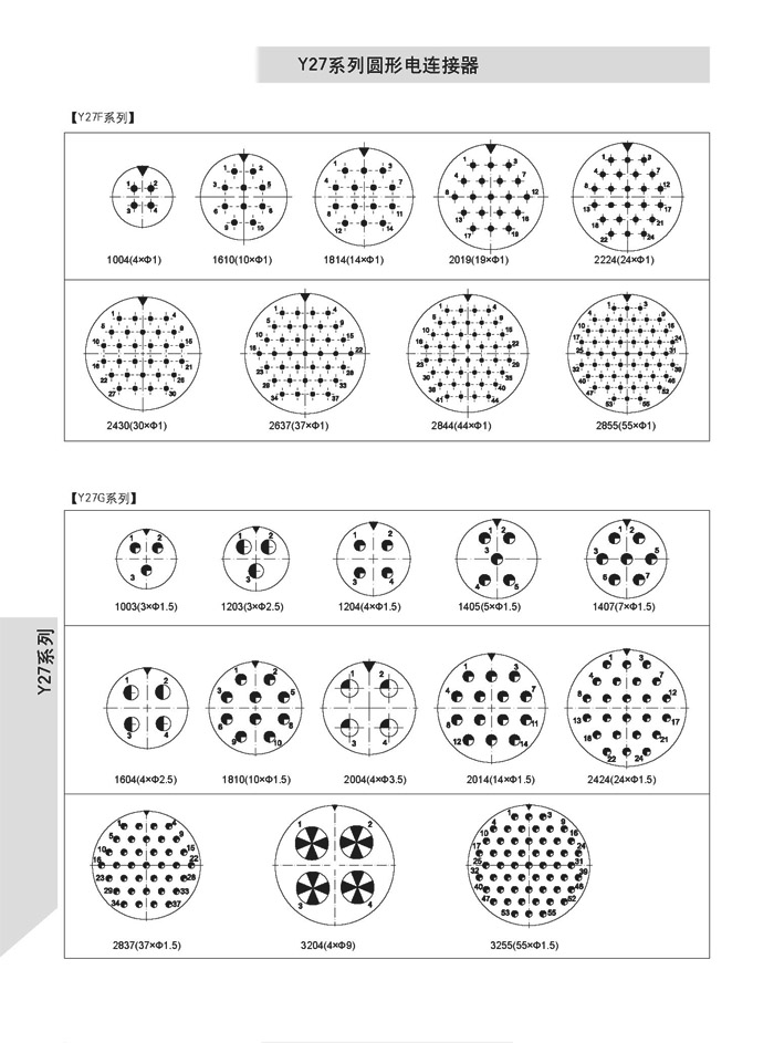Y27G-10芯25A推拉式航空電連接器,是Y27系列里電源系列,有接觸件10芯,2.5mm粗,可達25A,體積小,重量輕。插頭與插座采用推拉連接方式。材料有鋁、銅、不銹鋼供客戶選用,同等殼體有這么大電流的很少。其次就是混裝Y27C-2617型,有11芯可達50A,以下是接線芯譜,客戶根據自己的需要選擇。