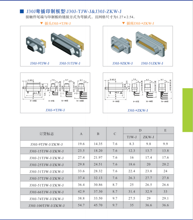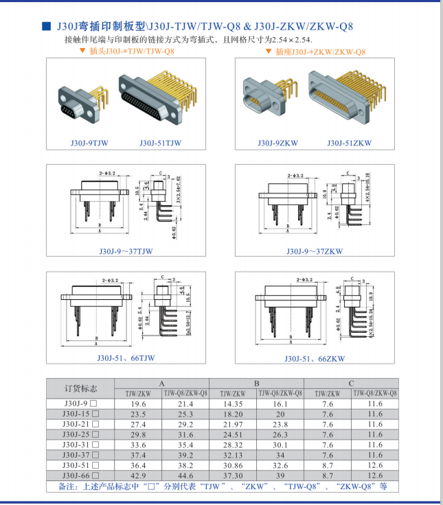 J30J-25TJ/ZKW彎式印制板矩形接插件,結構與正常矩形連接器是一樣的,,不同的是端接方式有所改變,除電纜式焊接,直式印制板焊接外。這個焊接插針是90°彎角。一般是用在小型儀器設備,空間小,而且線路板是平躺式的,與設備墻體成90°,在此要注意的是線路板上開孔時建議和廠家多聯系,按照廠家開孔圖紙進行打孔,以免誤差,以下是產品結構圖,氣功看看: