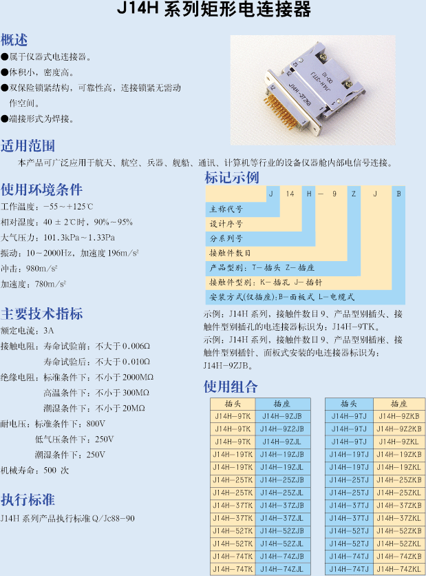 J14H-74ZJB/TJ矩形航空插頭插座,矩形連接器,雙保險鎖緊結構,體積小,密度高,端接形式為焊接.