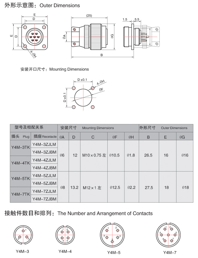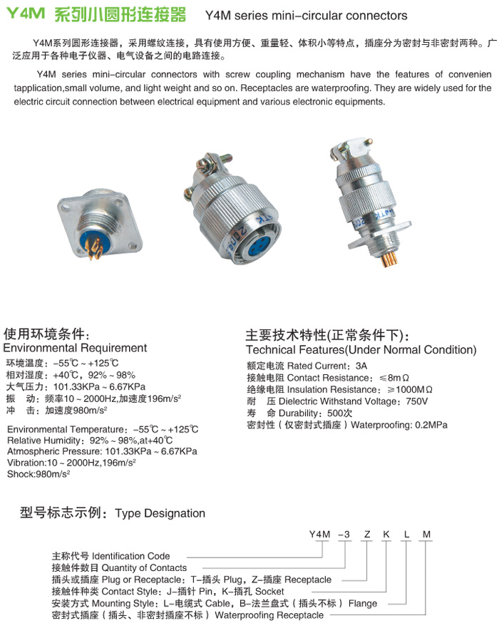 Y4系列小圓形電連接器,體積很小,金屬鋁外殼,重量輕,螺紋連接,插座密封,電連接可靠,使用方便,廣泛應用于各種電子儀器、電氣設備間的電連接。安裝方式有法蘭盤式和電纜式兩種。產品針、孔可以根據您的要求互換。