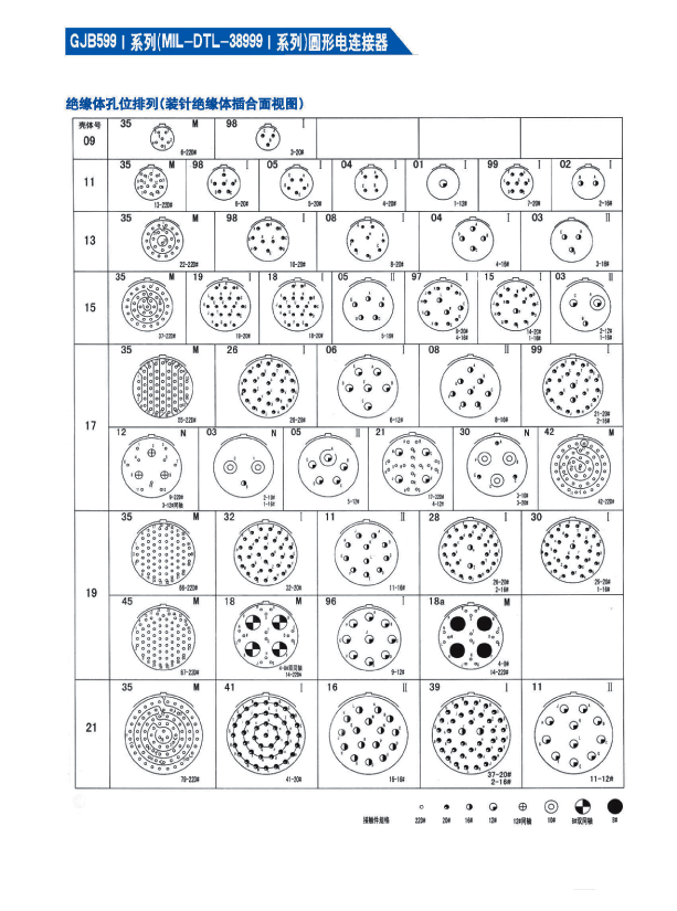 JY27467T15F35PN圓形電連接器,該產品符合GJB599A(MIL-DTL-38999K)系列要求,采用卡口式快速連接,接點密度高。15F35是產品排列芯譜,接觸件15芯,電流有大小,是怎么排列的?通過下面圖片就能了解。