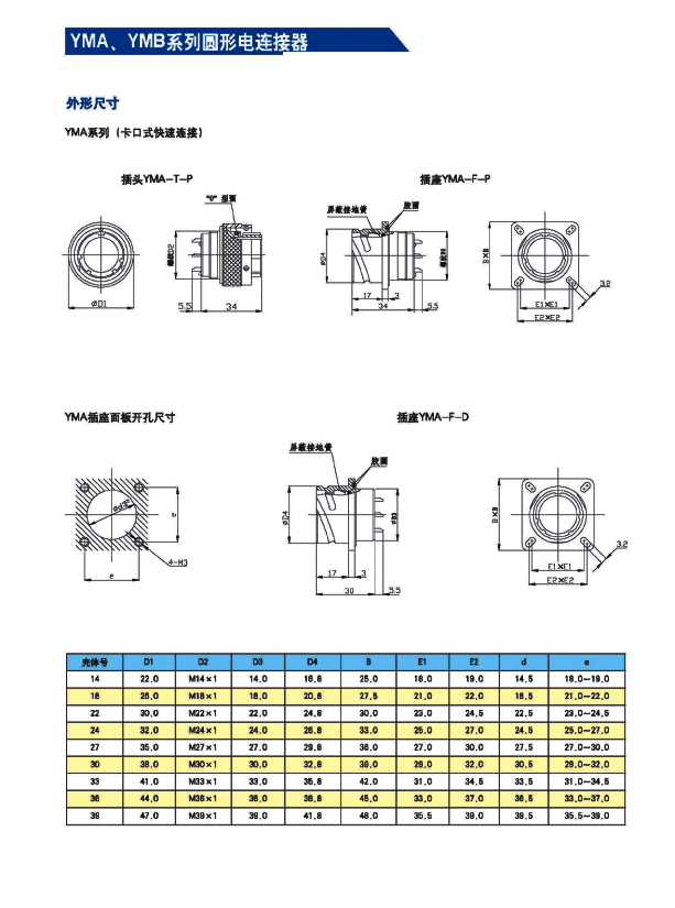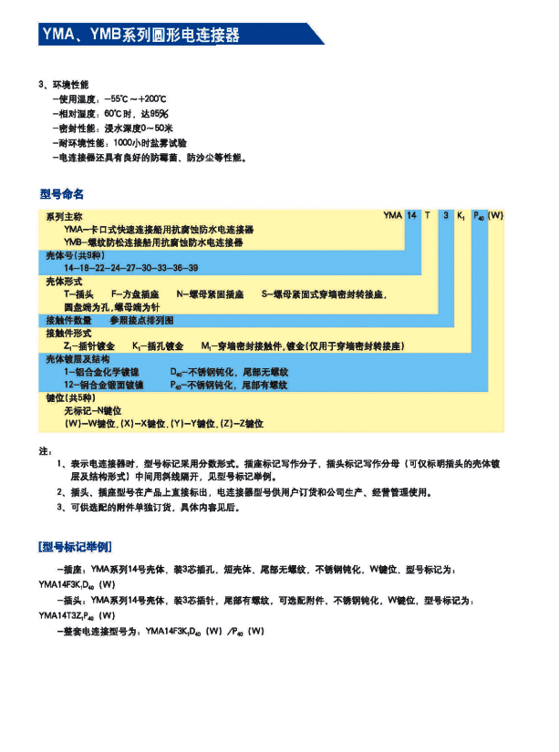 YMB水下50米防水密封圓形電連接器,適用于濕熱、浸水等惡劣環境,可耐50米水深密封,耐1000小時鹽霧試驗:YMA系列為卡口式快速連接,YMB系列圓形電連接器為螺紋防松連接,頭座均為焊接。