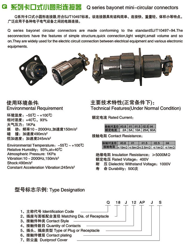Q型系列圓形電連接器,按電子工業(yè)部標(biāo)準(zhǔn)SJ1744-81制造,產(chǎn)品結(jié)構(gòu)可靠,操作方便。插針、插孔引線采用焊接形式,根據(jù)用戶需要,插頭、插座既可裝針,也可裝孔。該產(chǎn)品具有體積小、重量輕、快速連接、快速分離等特點(diǎn),被廣泛應(yīng)用于儀器儀表、電子設(shè)備間的電氣連接。