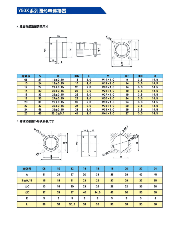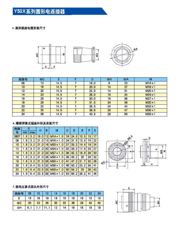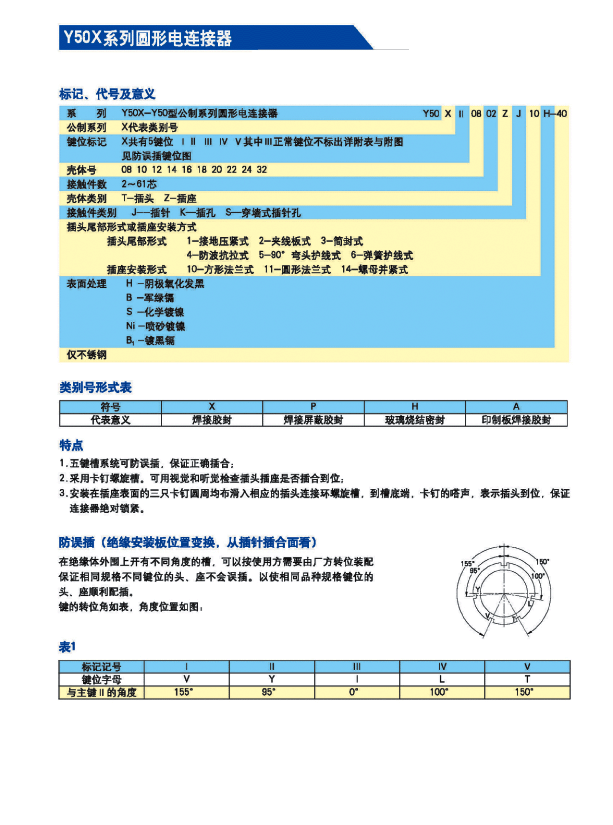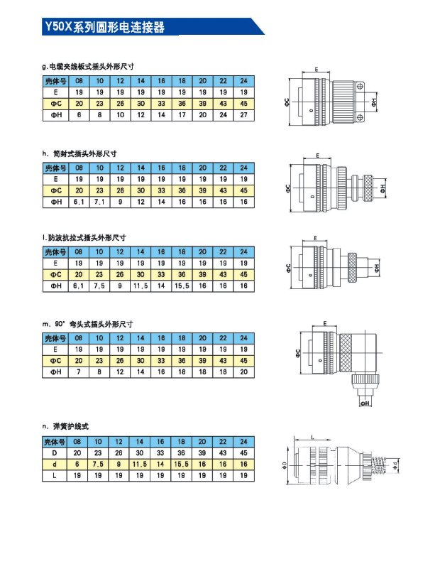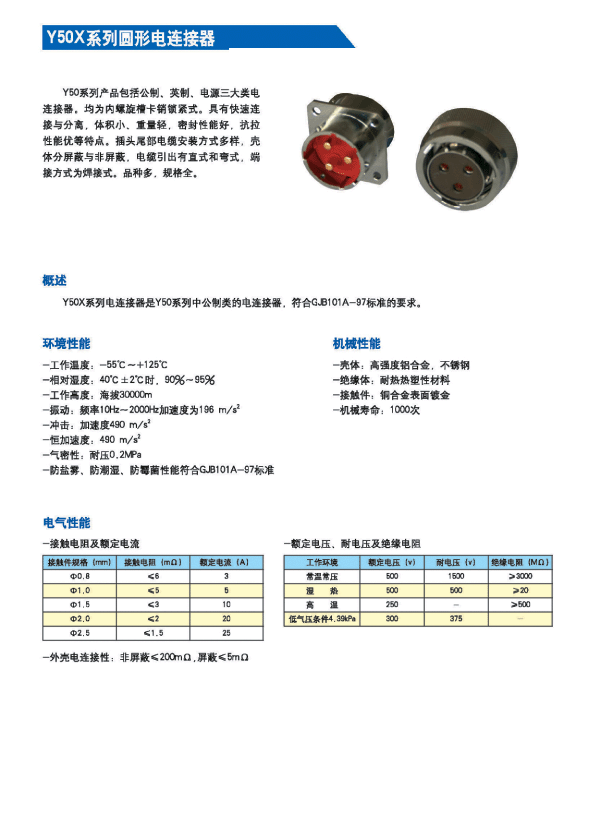 Y50X系列軍用電連接器,包括公制、英制、電源三大類電連接器。均為內螺旋槽卡銷鎖緊式。具有快捷連接與分離,體積小、重量輕,密封性能好,抗拉性能優之特點。插頭電纜罩有七種安裝方式,殼體分屏蔽與非屏蔽,電纜引出有直式和彎式,端接方式為焊接式。品種多,規格全。該產品可根據用戶需求改裝成濾波連接器。 均參照GJB101A—97,GJB598A—96,MIL—C—26482等標準的要求。適用于戰略、戰術系統,野外作業等電訊號、電能的連接。