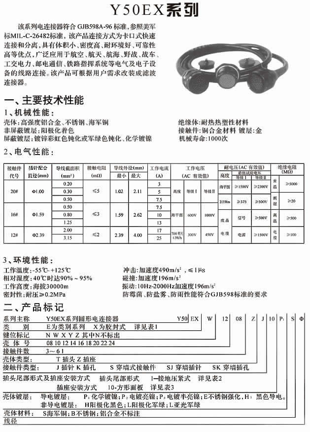 Y50EX-2461ZJ10/TK2多芯電連接器,采用卡口式連接系統,具有快速控接和快速分離,體積小、重量輕等特點。插頭有多種電纜安裝形式,即:電纜夾線板式、簡易封裝式、接地壓緊式、防波抗拉式、彎頭護線式、電纜話筒式和彈簧護線式等。電纜出線口備有各種規格不同的密封橡膠護線縣,能與電纜線緊密配接,增強了電纜線和連接器插頭的防雨、防水、防塵密封性和抗拉性能。接觸件焊接,殼體有屏蔽和非屏蔽以及多種鍍層可選,插座有一般密封和玻璃燒結密封等類觀,以適用不同的工作環境。適用于戰略戰術系統,電子對抗系統,野外作業電能,通訊信號連接系統,航大航空航海通訊和測試跟蹤系統,計算機系統、郵電鐵路指揮系統,進口醫療儀器設備等電能、電訊信號的近接。