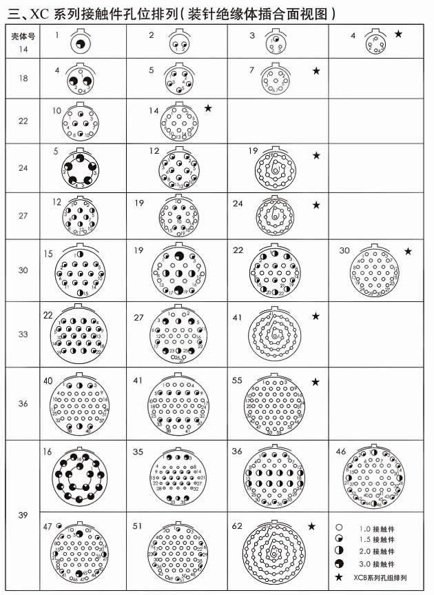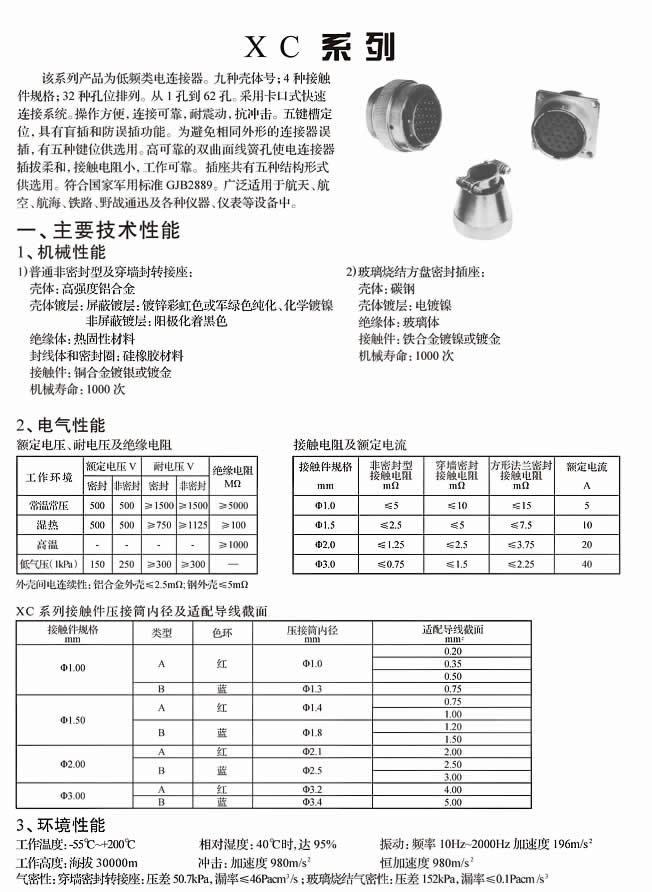 XC39F16K1D1/Z1P1+FJDP1線簧航空插頭為低頻類航空電連接器。九種殼體號,四種接觸件規格,32種孔位排列。從1孔到62孔。 采用卡口式快速連接系統。操作方便,連接可靠,耐震動,抗沖擊。五鍵槽定位,具有盲插和防誤插功能。為避免相同外形的連接器誤插,有五種鍵位供選用。高可靠的雙曲面線簧孔使電連接器插拔柔和,接觸電阻小,工作可靠。插座共有五種結構形式供選用。符合國家軍用標準GJB2889。廣泛適用于航天、航空、航海、鐵路、野戰通訊及各種儀器、儀表等設備中。 機械性能 1、普通非密封型及穿墻封轉接座 殼體:高強度鋁合金 殼體鍍層:屏蔽鍍層:鍍鋅彩虹色或軍綠色純化、化學鍍鎳 非屏蔽鍍層:陽極氧化著黑色 絕緣體:熱固型材料 封線體和密封圈:硅橡膠材料 接觸件:銅合金鍍銀或鍍金 機械生命:1000次 2、玻璃燒結方形法蘭盤密封插座 殼體:碳鋼 殼體鍍層:電鍍鎳 絕緣體:玻璃體 接觸件:鐵合金鍍鎳或鍍金 機械生命:1000次 環境性能 使用溫度:-55℃~+200℃ 振動:10Hz~2000Hz,加速度196m/s2 相對溫度:40℃時達95% 沖擊:加速度980m/s2 工作高度:海拔30000m 恒加速度:980m/s2 氣密性:穿墻密封轉接座:壓差50.7kPa,漏率≤46 kPacm3/s 玻璃燒氣密性:壓差152kPa漏率≤0.1 Pacm3/s XC系列航空接插件還具有較好的防潮濕、防鹽霧、防霉菌、防淋雨、防沙塵等性能。