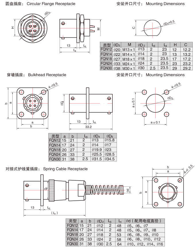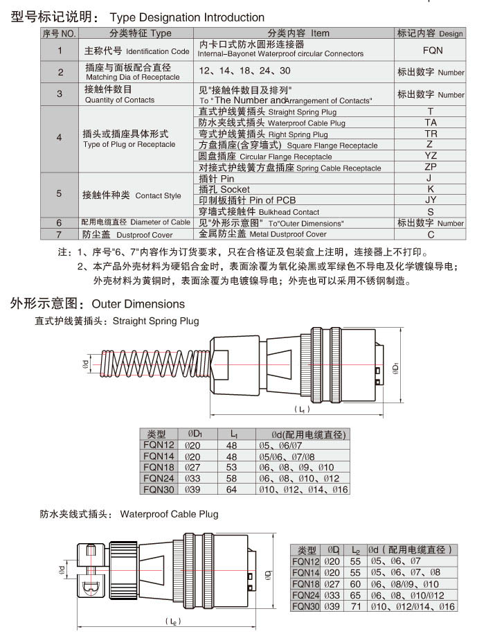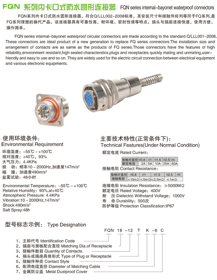 FQN系列內卡口式防水型圓形電連接器,符合Q/LLL002-2008標準,產品價格的安裝尺寸及接點型譜等同FQ和Q系列產品價格,是FQ系列產品價格的改進型。體積小,重量輕,內卡口快速連接,零件由鋁棒或銅棒車加工制造(非鋁壓鑄件),耐環境,防水、防鹽霧、防霉菌,操作使用簡便。插針、插孔引線采用焊接式。產品價格被廣泛使用于各種電子儀器、電子、電氣設備間有防水要求的電連接中。產品價格符合按鐵道部標準TB/T2761。產品價格針、孔可以根據您的要求互換。