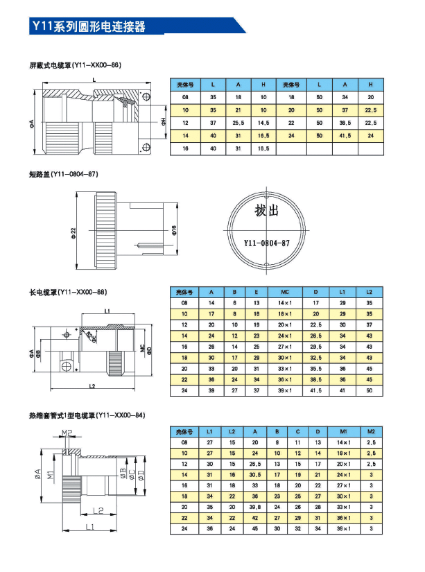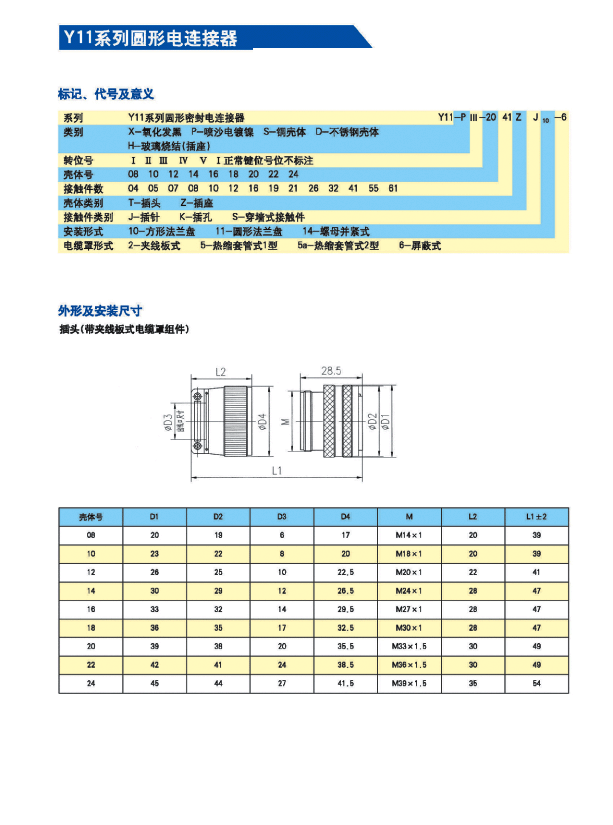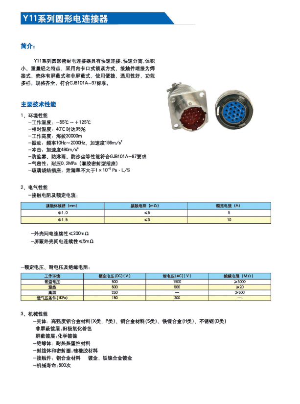 Y11系列軍用圓形電連接器 ,符合GJB101A-1997標準,適用于戰(zhàn)略武器系統(tǒng)、航天衛(wèi)星系統(tǒng)、航空航海運輸工具、地面發(fā)射和接收系統(tǒng)、高能高熱工業(yè)系統(tǒng)、工交電力系統(tǒng)等的電信號連接。 本產(chǎn)品是具有快速連接和快速分離、體積小、重量輕等諸多優(yōu)點的內(nèi)卡口式鎖緊的圓形電連接器。接觸件為焊接式,殼體有屏蔽和非屏蔽兩種,具有密封、防塵和防雨的性能。安裝方式有法蘭盤式、螺母拼緊式、穿墻式等。