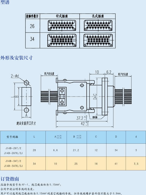 J14B-26ZJ/TK矩形航空插頭,在J14A系列連接器外殼的基礎上,增加了接觸件的密度和防雨功能。帶電纜,端接形式為壓接,電纜規(guī)格和長度由用戶確定。