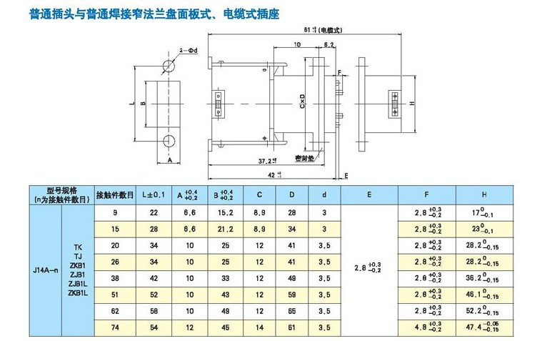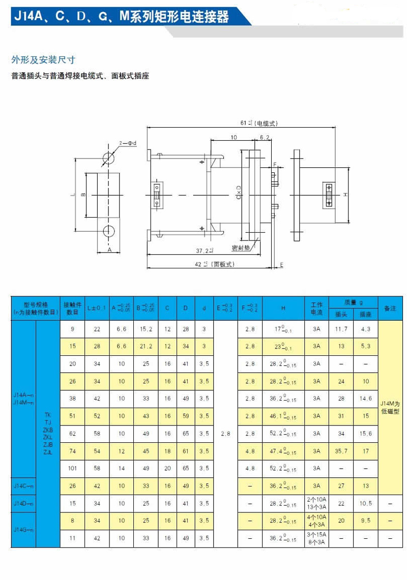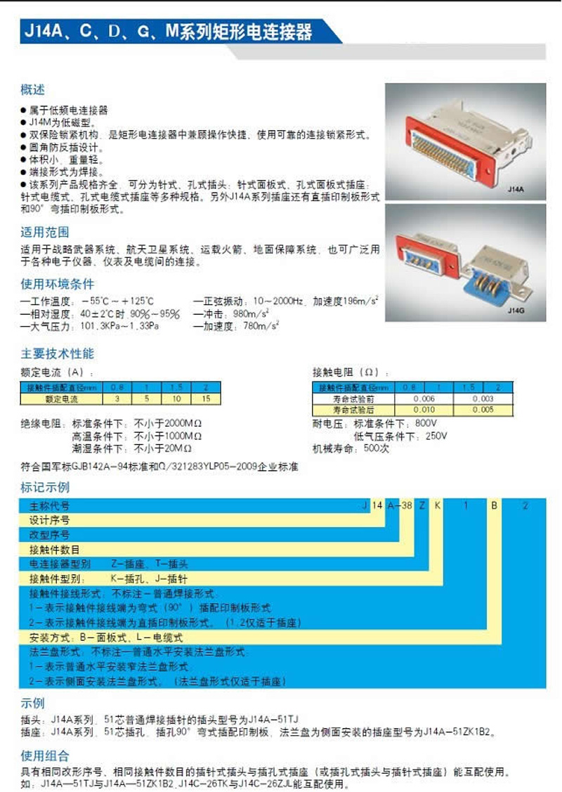 泰興永志J14矩形航空插頭,矩形插頭座,執(zhí)行Q/HD20037-2007詳細(xì)規(guī)范,屬于低頻系列,采用雙保險鎖緊結(jié)構(gòu),是矩形電連接器中兼顧操作快捷、使用可靠的連接鎖緊形式。J14B系列產(chǎn)品在J14A系列連接器外殼的基礎(chǔ)上,增加了接觸件的密度和防雨功能,具有圓角防誤插設(shè)計,體積小,重量輕,插座面板固定,端接形式為導(dǎo)線壓接式,電纜規(guī)格和長度由用戶確定,主要適用于各種電子儀器間的電氣連接。
