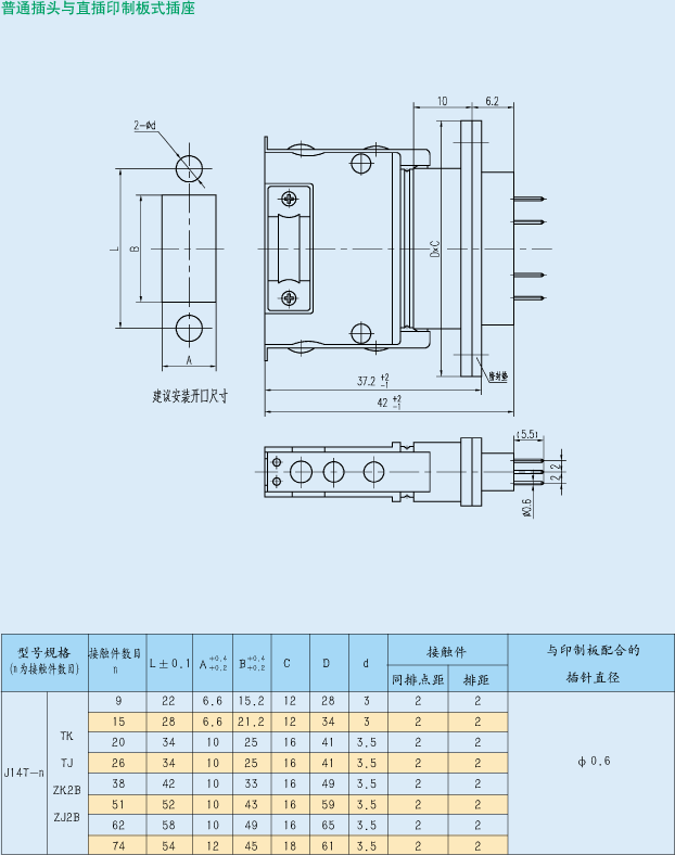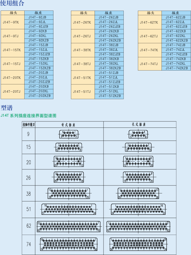 示例:J14T系列,接觸件數目為15、產品型別插座,接觸件型別插針,面板式安裝的電連接器標識為:J14F-15ZJB.