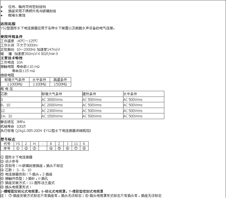 8芯深水電連接器 ,內(nèi)外全部選用不銹鋼材料,插座采用玻璃封結(jié)特殊工藝,耐海水腐蝕。連接方式為螺紋連接,里面有雙層密封設(shè)計(jì),使用方便,可快速插拔,殼體為高強(qiáng)度不銹鋼(316)、具有抗強(qiáng)腐蝕(酸、堿)、寬溫度環(huán)境和高壓特點(diǎn).由于產(chǎn)品的特殊性,客戶要提前訂購。 廣泛應(yīng)用于深海勘探、深水?dāng)z像、水下作業(yè)的各種電氣設(shè)備、水下機(jī)器人。