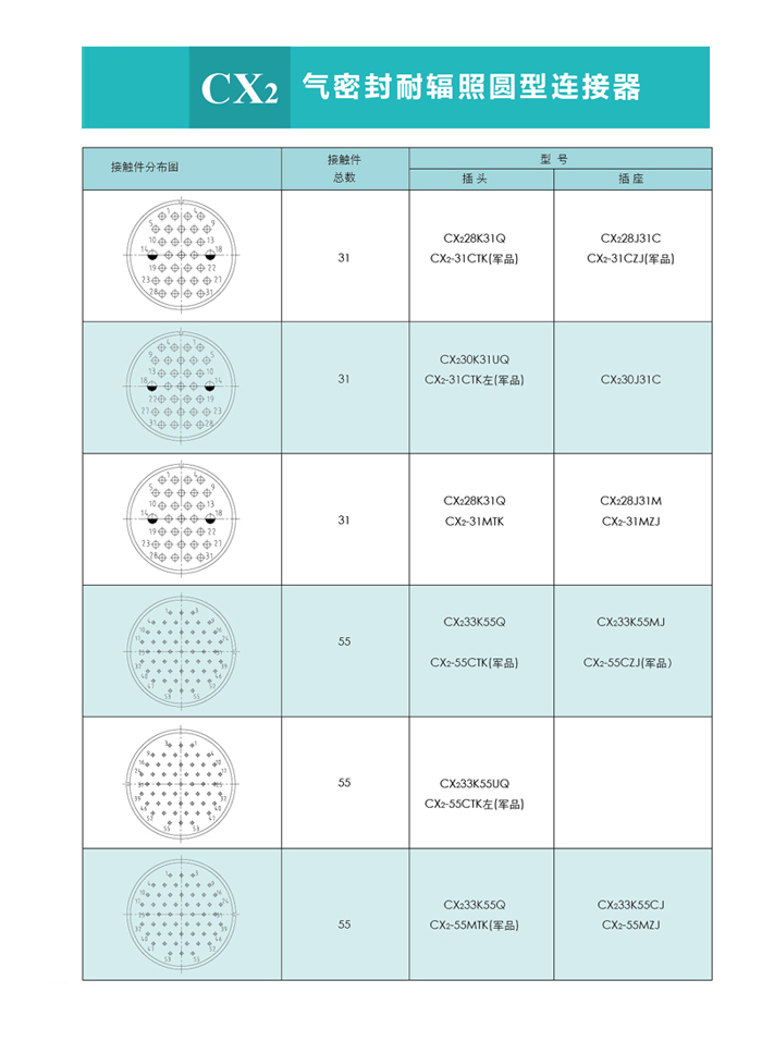 CX2系列氣密封圓形連接器,主要技術參數非等效采用美軍標MIL-C-26482G。廣泛應用于各種電子儀器、密封容器的子設備與電源之間的電路連接。該系列連接器的連接方式為螺紋鎖緊連接,使用方便。插座采用玻璃燒結工藝,氣密性好。
