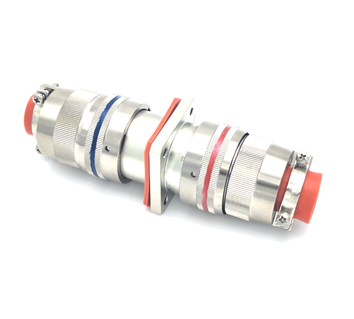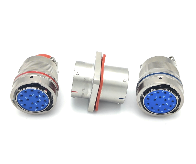 16芯 穿艙式 10A 真空密封連接器:16根插針,額定電流10A,穿艙加長,厚度達10mm左右,解決了銑鋼板的困苦,增強了壁厚的強度。插座兩頭是插針,玻璃燒結制作,燒結厚度6mm,耐壓,抗沖擊。插頭和插座卡口連接,方便可靠。里外插頭用鍵位、顏色區分,防止插錯。